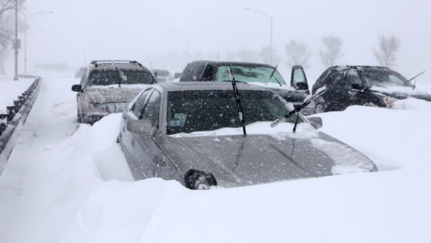 Hundreds of cars were stranded on Lake Shore Drive in Chicago, Wednesday, Feb. 2, after a winter blizzard of historic proportions wobbled the otherwise snow-tough city.